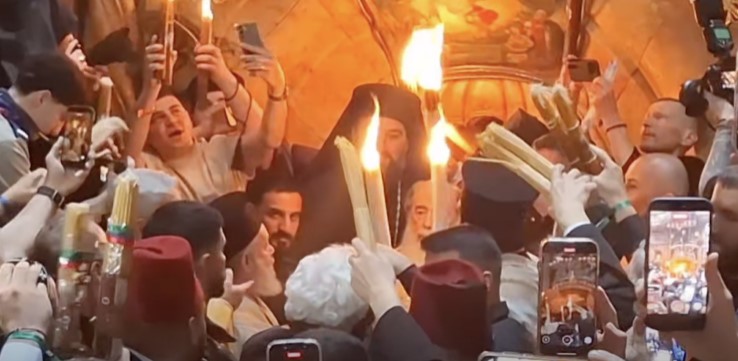Jeruzalémský patriarcha Theofilos III. vyšel z kostela se zapálenými pochodněmi a 33 svíčkami, rozdával Svatý oheň přítomným věřícím a sděloval poselství naděje a vzkříšení.