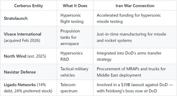 Národní obranná strategie 2026 doporučuje investice do „inovativních technologií“ a „autonomních systémů“. Cerberus Ventures – riziková kapitálová divize společnosti – zaměřila svou investiční strategii právě na tyto konkrétní oblasti. A Feinberg ze své pozice v Pentagonu uvolnil pravidla zadávání veřejných zakázek, aby vytvořil „zrychlenou cestu“ pro malé podniky – z nichž mnohé mají vazby na Cerberus – s cílem zajistit jim zakázky s jediným dodavatelem a bez konkurence pod záminkou „požadavků souvisejících s misí“.