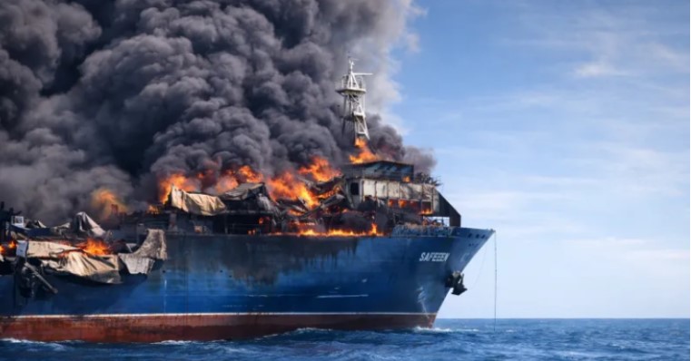Videozáznam kolující na internetu ukazuje velký požár na palubě thajského ropného tankeru, který se pokoušel prolomit blokádu Hormuzského průlivu. Loď je téměř celá zničena plameny. Osud posádky je v současné době neznámý.